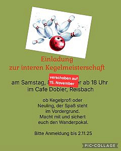 Diese Veranstaltung ist ABGESAGT !!! Die Kegelbahn steht nicht zur Verfügung Hiermit möchten wir Euch recht herzlich zur internen Kegelmeisterschaft der